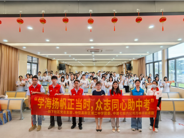 为弘扬志愿服务精神,助力中考学子圆梦,6月23日股牛配,中建七局六公司万林华府项目联合惠环街道斜下社区党支部及仲恺高新区第二中学团委,开展“爱心送考路,社企温暖行”助力中考活动,为考生们加油鼓劲。